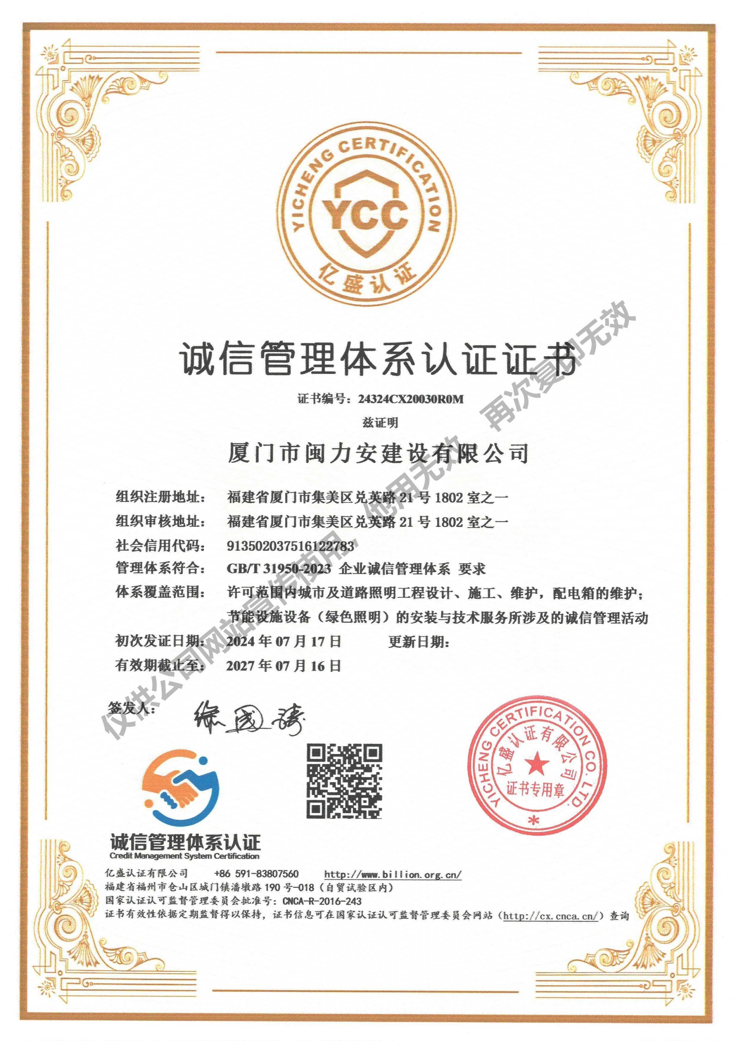 廈門市閩力安建設(shè)有限公司成立于2003年,公司取得市政公用工程施工總承包貳級、建筑裝修裝飾工程專業(yè)承包壹級、城市及道路照明工程專業(yè)承包壹級、電子與智能化工程專業(yè)承包貳級、消防設(shè)施工程專業(yè)承包貳級、電力工程施工總承包叁級、建筑機(jī)電安裝工程專業(yè)承包叁級、輸變電工程專業(yè)承包叁級、環(huán)保工程專業(yè)承包叁級、照明工程設(shè)計(jì)專項(xiàng)甲級、建筑裝飾工程設(shè)計(jì)乙級、施工勞務(wù)等資質(zhì)的綜合型企業(yè),公司于2013年通過了ISO9001質(zhì)量體系認(rèn)證,ISO14001環(huán)境管理體系認(rèn)證,OHSAS18001職業(yè)健康安全管理體系認(rèn)證。